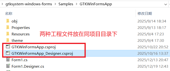 因为GTKSystem.Windows.Forms框架工程与原生的C#窗体应用程序工程的程序是相通的,可同时使用两套框架工程,共管项目窗体文件。